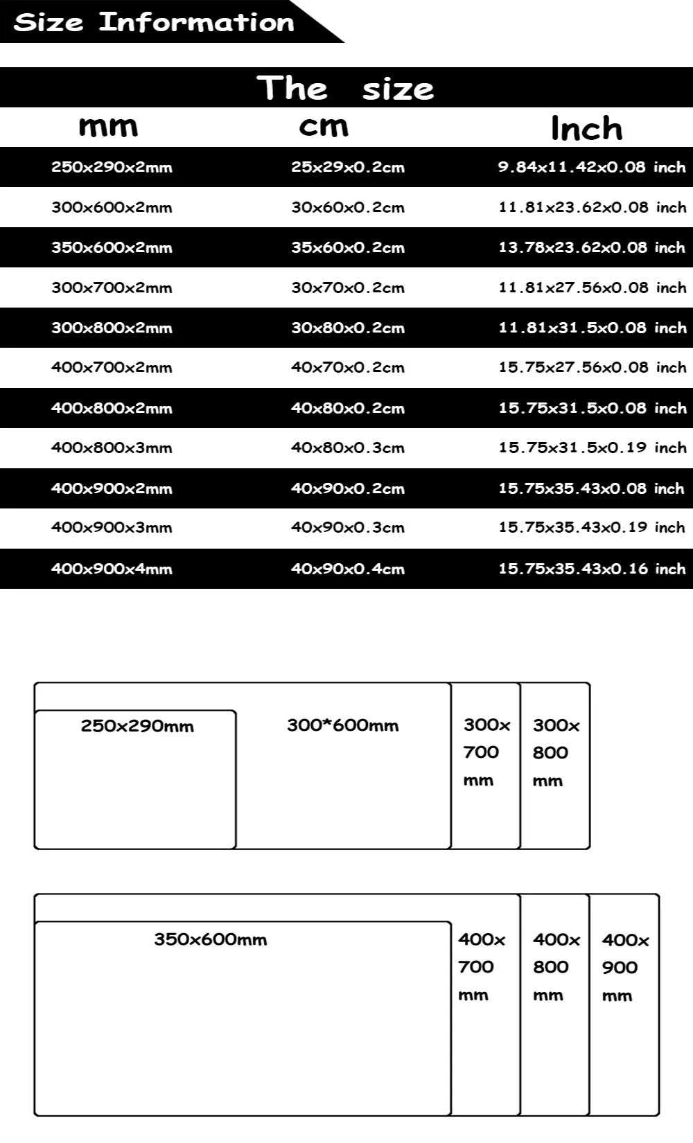 Le misure variano in base al modello (es. **Small 60×30**, **Large 90×40**, **XXL 120×60**).